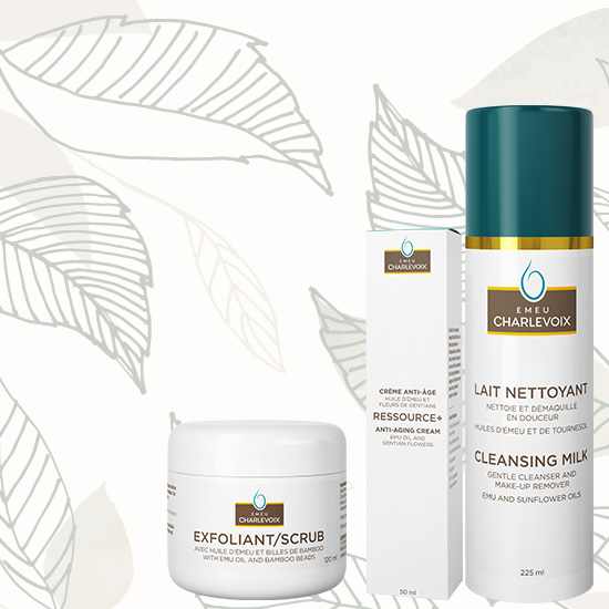 Le trio EMEU CHARLEVOIX aidant à prévenir les points noirs : Lait nettoyant-démaquillant, l’exfoliant aux billes de bamboo et la crème hydratante adaptée à votre âge.