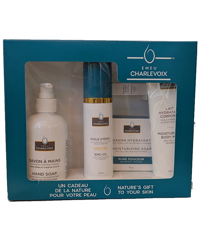 Ce coffret complet réunit une huile d’émeu 100 ml, une crème eczéma 100 ml, un baume 5 g, un exfoliant doux 60 ml et un savon 90 g. Une routine simple et efficace pour calmer les rougeurs, réduire la sécheresse et soutenir la réparation naturelle de la peau. Idéal pour les peaux sensibles qui ont besoin de confort et de douceur.